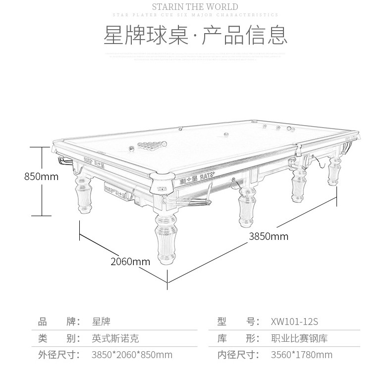 - 星牌 XW107-12S 英式斯諾克臺(tái)球桌
